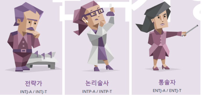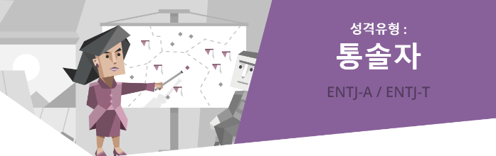 - ENTJ 통솔자 - 결단력과 통솔력이 뛰어난 리더형 인물로 대담하며 의지가 강해 문제 해결 방법을 찾아내는 지도자