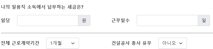 일당과 근무일수 등 몇 가지 간단한 항목을 입력하면 자동으로 소득세를 계산할 수 있기 때문에 바로 일용직 소득세를 계산하고 싶다면 일용직 소득세 자동계산기를 활용해 보시기 바랍니다.