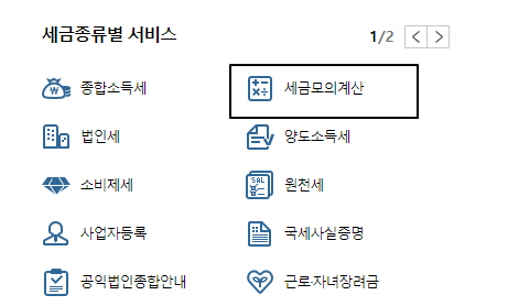 국세청 홈택스 홈페이지 메인 화면에 보시며 모의계산 메뉴가 있습니다. 모의계산 페이지로 이동하게 되면 다양한 세금을 쉽게 모으로 계산해 볼 수 있도록 제공하고 있습니다.