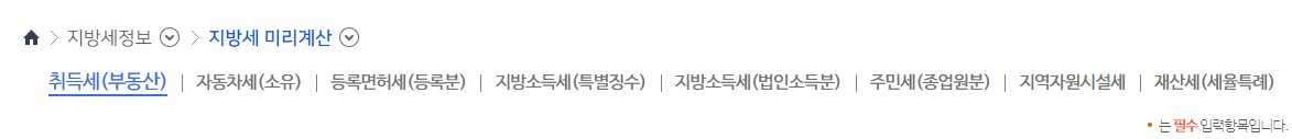 위택스 홈페이지 접속 후 '지방세 미리 계산해 보기'를 클릭하면 취득세 등록세 계산기로 이동합니다.