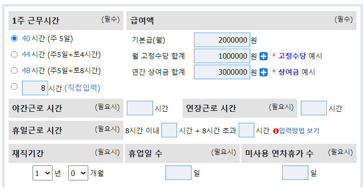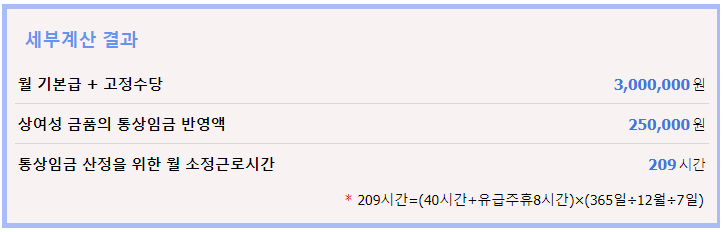 월근로시간 209시간 계산을 적용하고 주 근로시간 40시간, 주휴시간 8시간, 월기본급에 고정수당에 월간 상여금을 더하여 월 급여는 3,250,000원이며 시간당 통상임금은 15,550원이 됩니다.