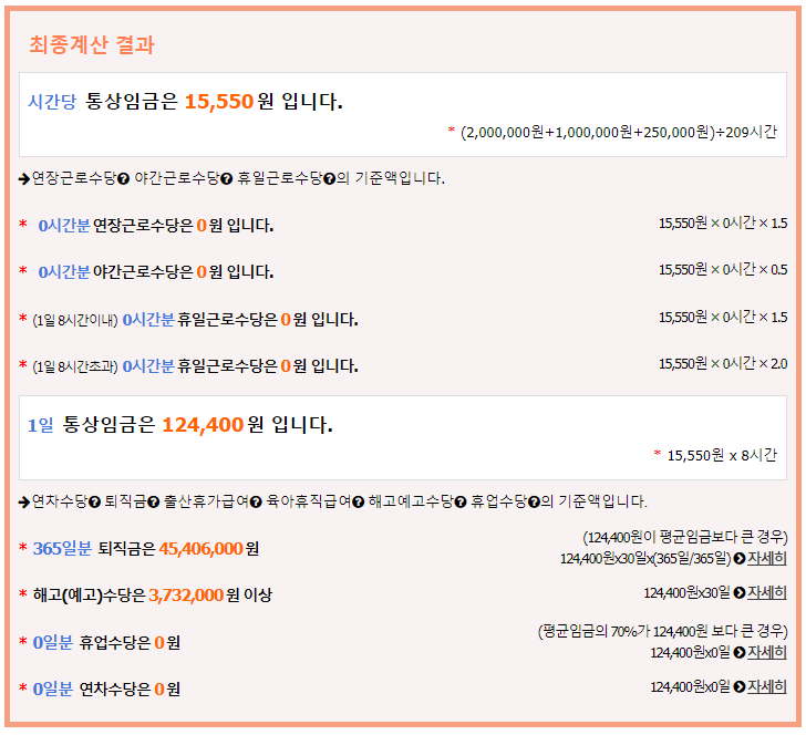 예를 들어 주 5일, 8시간 근무, 월 기본급 200만 원, 월 고정수당 100만 원, 연간 상여금 300만 원이라면 통상임금 계산방법은 다음과 같습니다.