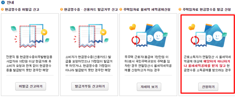 먼저 홈택스에서 월세 환급을 신청하는 방법을 알려드리겠습니다. 홈택스 메인 화면에 (상담, 불복, 고충, 제보, 기타) 메뉴를 클릭한 후 (현금영수증, 신용카드 미발급, 발급거부, 주택임차료) 현금영수증 발행으로 들어갑니다.