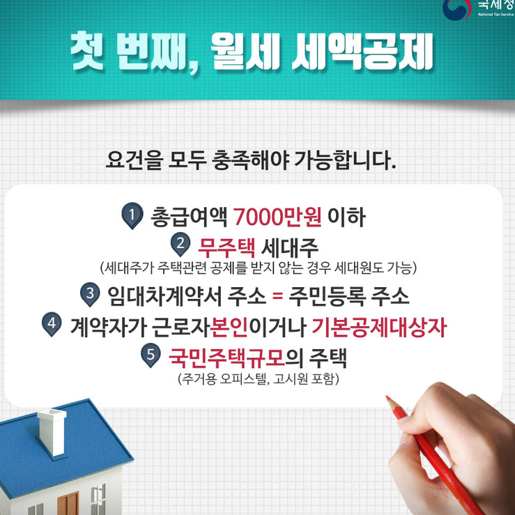 월세 환급제도 조건 주택 기준으로는 임대차계약서의 주소지와 주민등록상 본거주지가 동일해야 하며 국민주택규모이거나 기준시가 3억 원 이하인 주택만 해당이 됩니다.