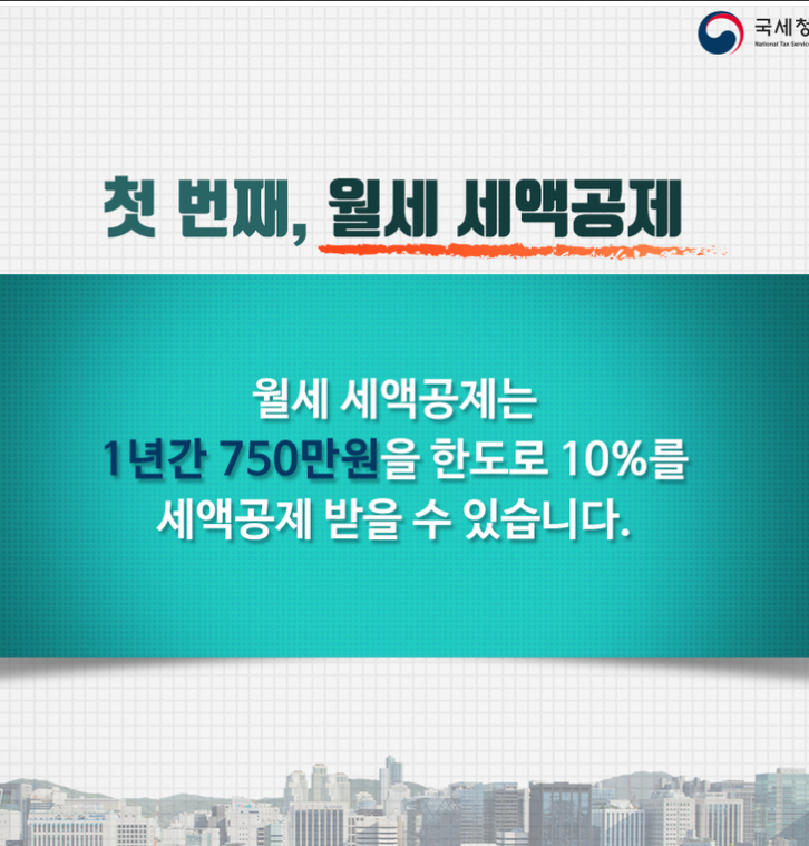 총급여액이 7,000만 원 이하인 경우 15%, 총급여액이 5,5000만 원 이하인 경우 17% 공제가 가능하며 월세액은 최대 750만 원, 세액공제 최대 102만 원입니다.