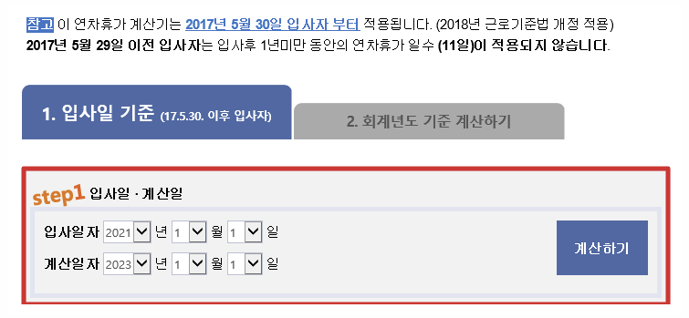 복잡한 연차휴가일수 계산이 아닌 쉽고 간단하게 연차휴가일수를 계산하고 싶다면 연차휴가일수 계산기를 활용해서 계산해 보시기 바랍니다.
