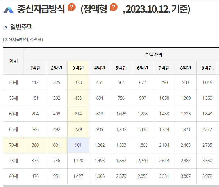 예를 들어 70세, 3억 원 주택 기준으로 보면 2023년 10월 기준 매월 78만 4천 원을 수령합니다.
