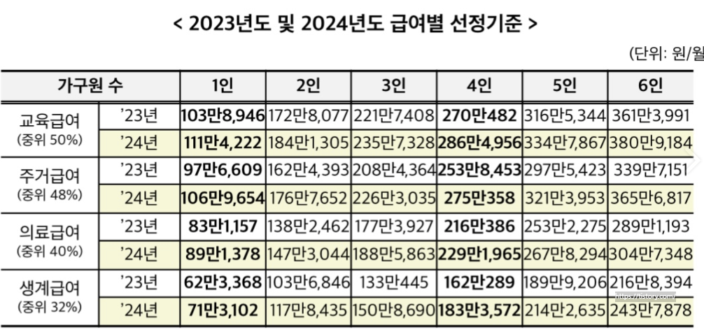 기초생활수급자 생계급여 자격요건으로는 기준 중위소득 32% 이하인 가구가 생계급여의 대상이 됩니다. 지난해 기초생활수급자 생계급여 중위소득 30%에서 2024년에는 중위소득 32% 이하로 변경되었습니다.